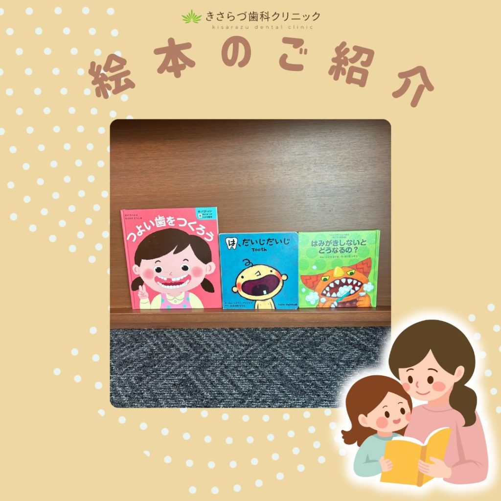 待合室に新しく、歯にまつわる絵本を3冊置きました。
